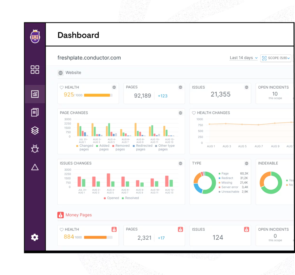 Optimize your site for peak technical performance and the best user experience with Conductor’s real-time technical monitoring solution through ContentKing.