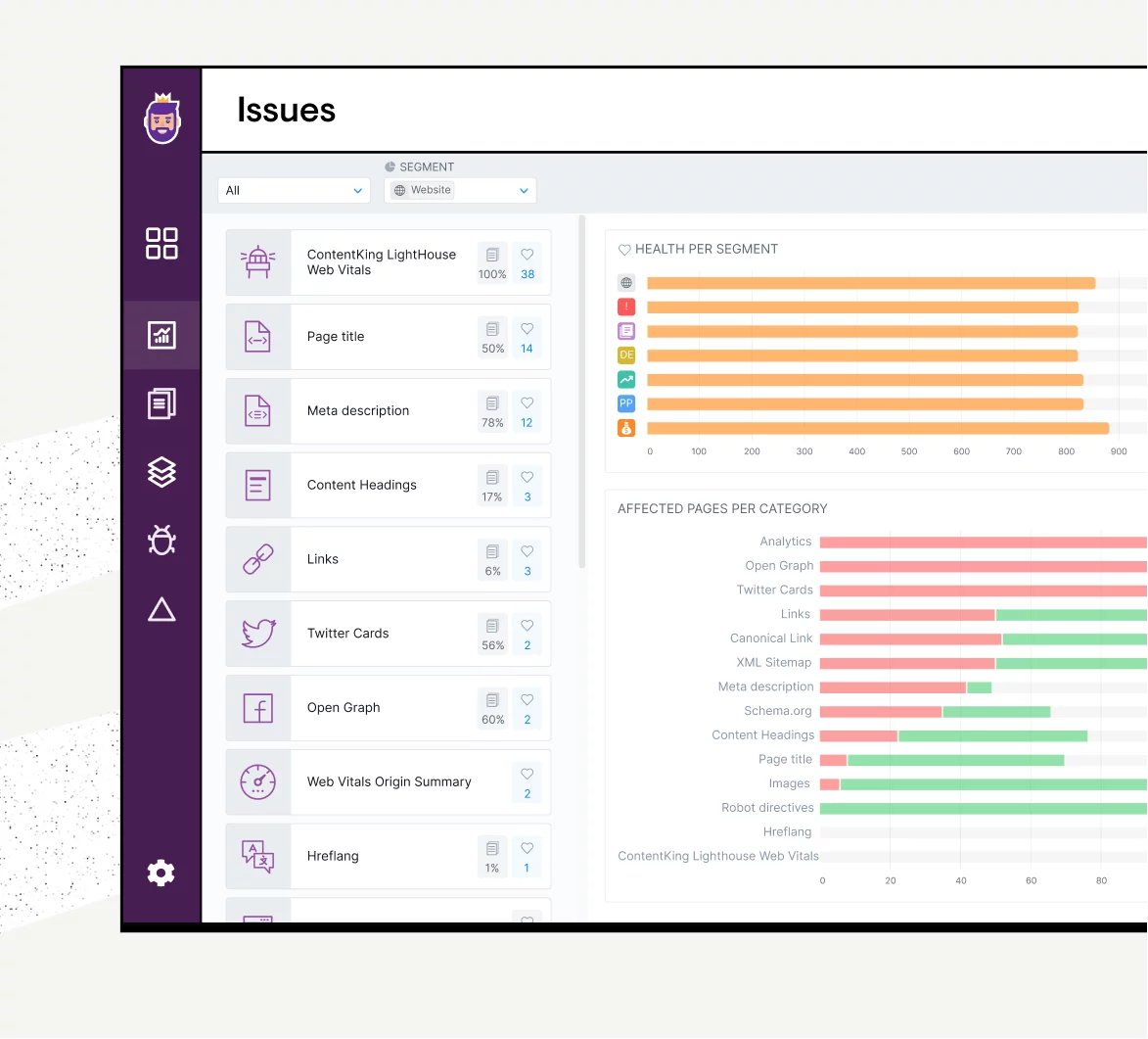 ContentKing is the only 24/7 SEO auditing and monitoring platform that helps you keep track of everything happening on your site as it happens, with opportunities prioritized by impact and scale.