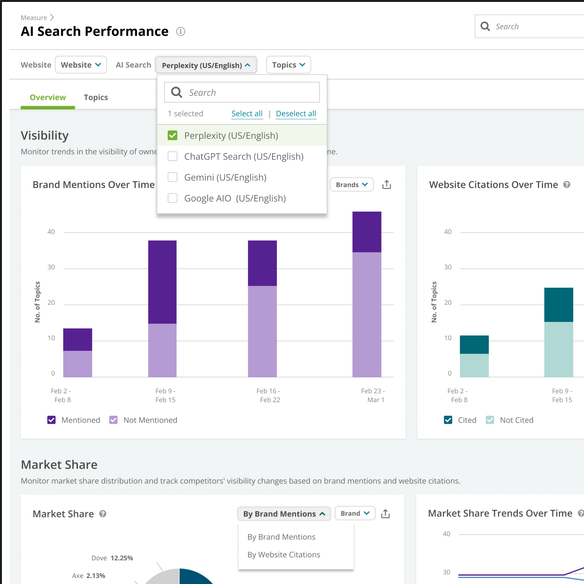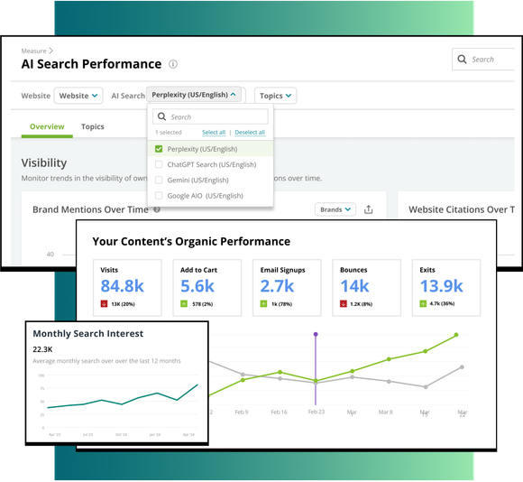 Track your mentions, citations, and sentiment in AI answer engines like ChatGPT and Perplexity, right alongside your performance in traditional search.