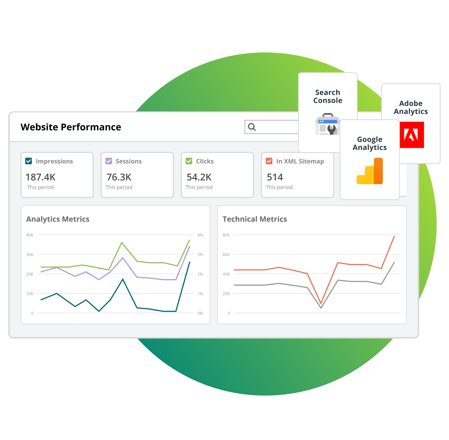 Analyze traditional and AI search visibility, content analytics, and technical performance side-by-side —so you can measure ROI and prioritize opportunities across your entire site and for every page.